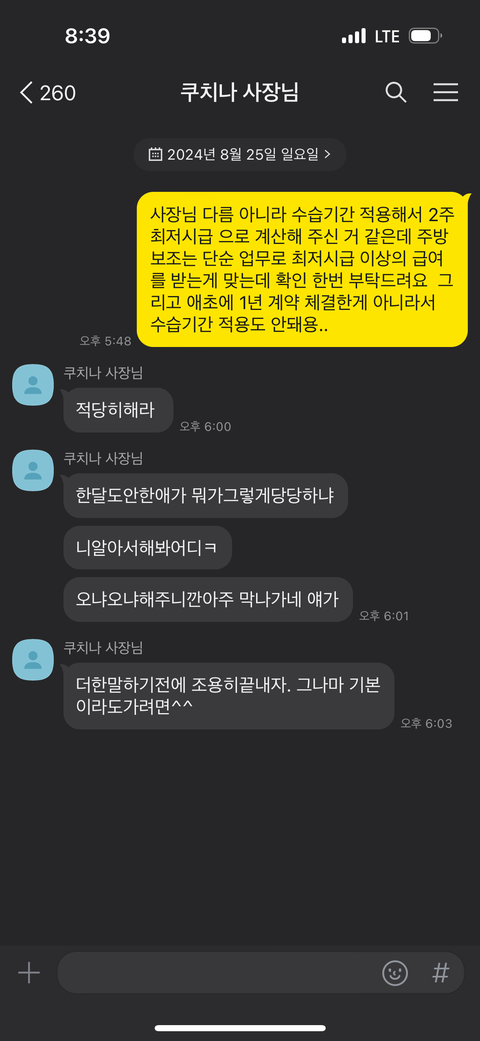 일하다 허리 디스크가 생겨서 그만 두게 됐아 군데 갑자기 1달 이내 그만둬서 최저시급으로 입금한다고 사전에 얘기없던 말을 하대 그래서 그건 아닌 거 같다 하니까 알겠다 하더니 결국 사전에 미리 말도 없던 수습기간 2주를 만들어서 2주 최저시급으로 계산하고 입금함 아래 사진이 그래서 내가 최대한 공손하게 말씀 드린 부분. 근데 바로 급발진이 날라오고 차단까지 당함 이런경우 어떻게 해야함?