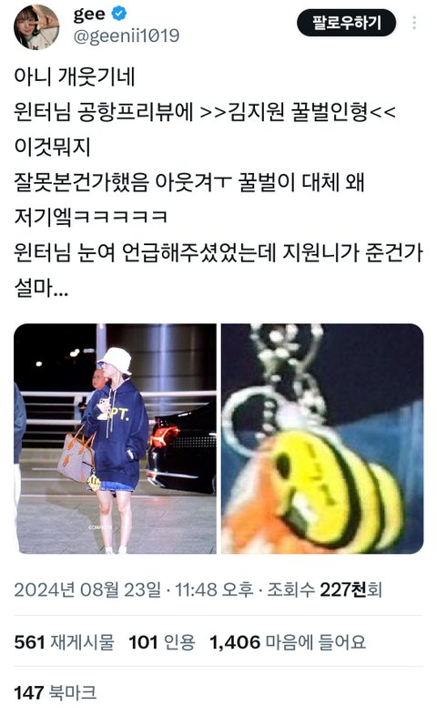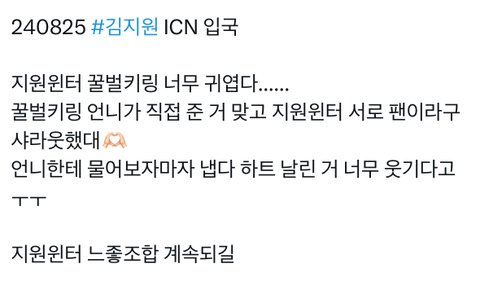 모르는 사람들 있을까봐 올림 꿀벌인형은 김지원이 팬미팅때 팬들에게 역조공했던건데 김지원이 윈터한테도 직접 줬음
