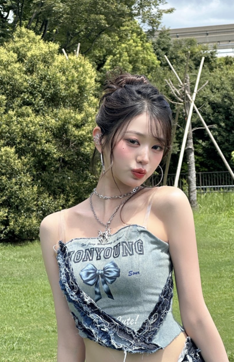 공개된 사진 속에서 장원영은 똥머리로 틀어올린 헤어스타일과 볼과 입술에 색조가 돋보이는 화려한 메이크업으로 반짝이는 미모를 뽐냈다. 어깨와 쇄골라인이 드러난 청바지 소재의 크롭탑을 매치해 키치하면서도 발랄한 매력을 선보였다.
