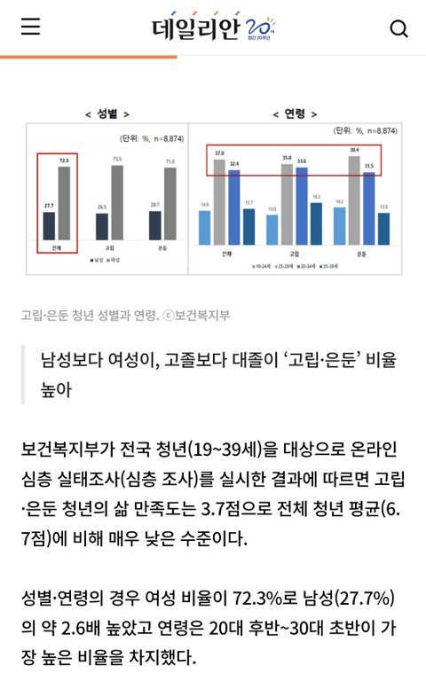 고립은둔 청년비율 여성이 남성보다 2.6배 가량 높음. 얼마나 취업이 안되고 살기가 힘들면 취업도 못하고 방구석에서 남혐질이나 하고있음? ㅋㅋ 국민건강공보험공단 우울증 2022년 기준 진료 인원은 여성이 67만4,555명으로 남성 32만6,189명의 2배 이상, 연령대별로는 20대 여성이 12만1,534명으로 가장 많았으며, 30대 여성이 11만,2,563만명으로 그 다음을 이었다. 이게 현실이다 여자들아 ㅋㅋ 백날 방구석에서 발광 해봤자 인생 망하는건 니들임 ㅋ 니들 말대로 한국은 남성한테 유리한 국가가 맞음. 20대 기준 남성이 여성보다 15% 가량 소득이 높음 30대 기준 남성이 여성보다 50% 가량 소득이 높음 40대 기준 남성이 여성보다 100% 가량 소득이 높음 50대 기준 남성이 여송보다 130% 가량 소득이 높음. 미혼 남녀 자가소유 비율, 4050 기준 50%가량 남성이 압도함. ㅇㅇ 니들 말대로 한국은 남성한테 유리한 국가 맞으니까 빠르게 이민들 가라 제발 ㅋ 방구석에서 남혐질 하고 있어봣자 에이징 커브오고 인생 나락 가는건 결국 느그 한국여자들임 ㅋㅋㅋㅋ 이게 100% 팩트고 현실임 이미 통계부터 모든걸 증명하는중 ㅋ