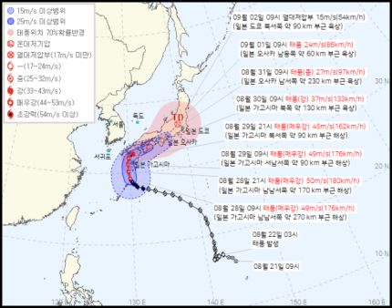 기상청은 태풍이 29일까지 규슈 남부에 매우 강한 세력을 유지한 채 접근해 규슈에 상륙할 것으로 전망했다.