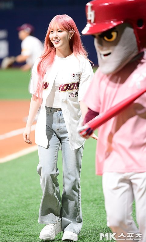 경기에 앞서 걸그룹 케플러 채현이 시타를 하기 위해 타석에 들어서고 있다.