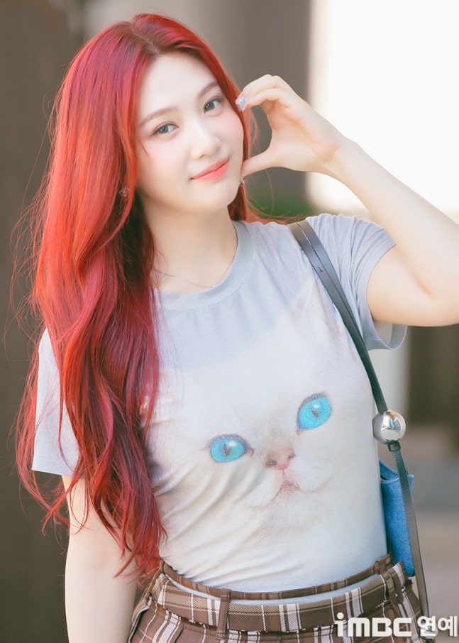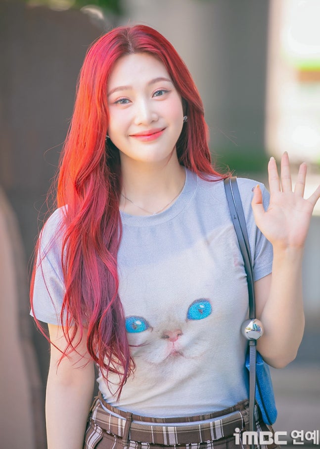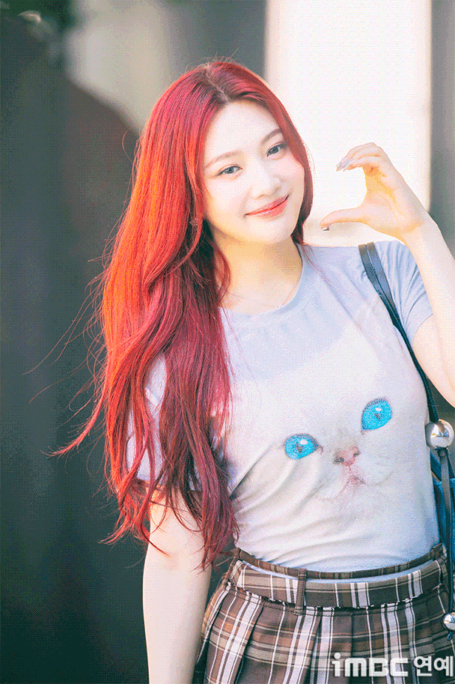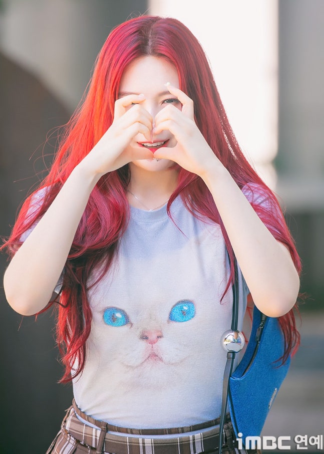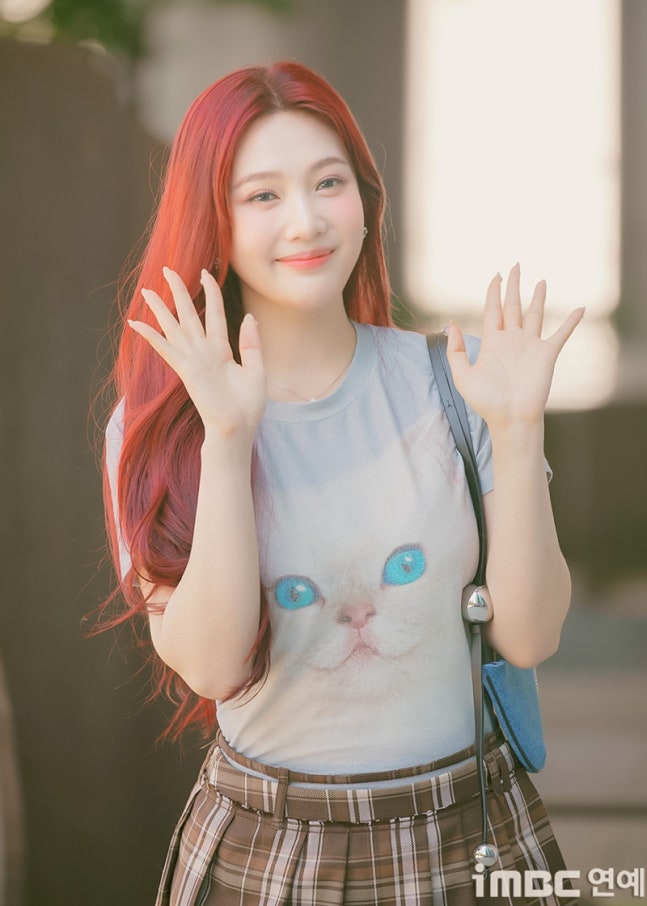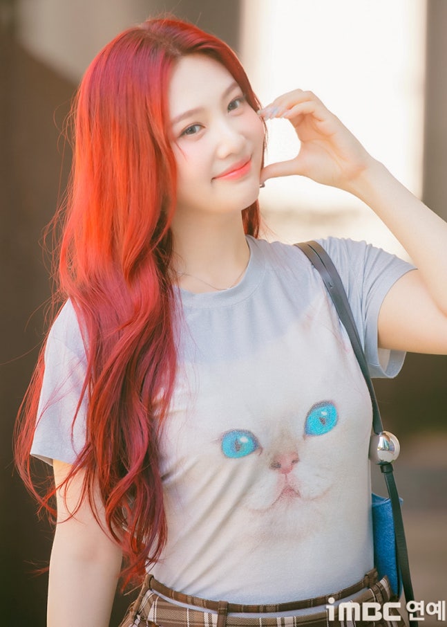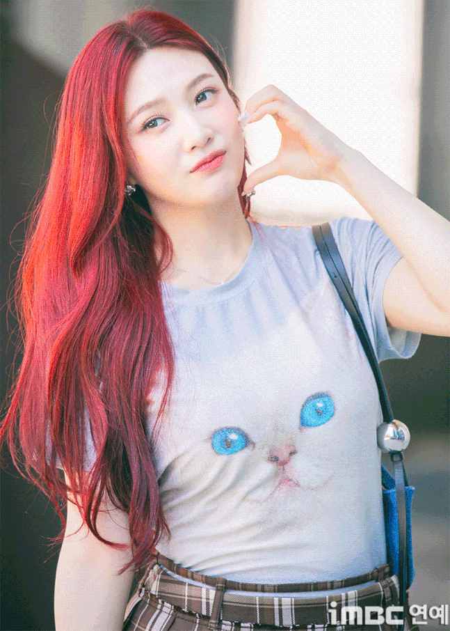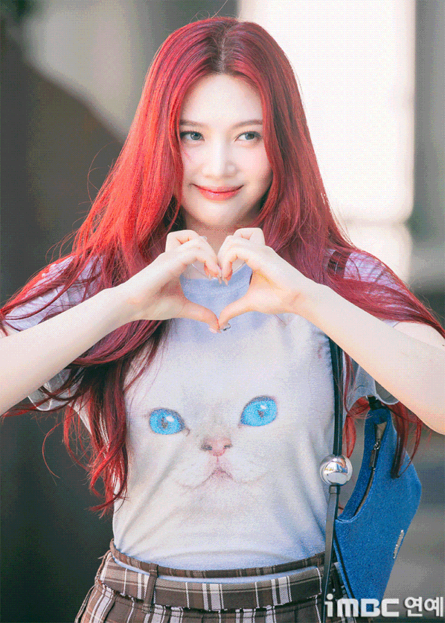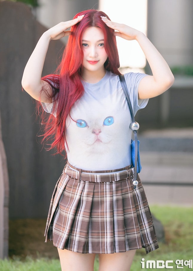 이날 조이는 '빨간맛'이 연상되는 레드 컬러의 롱 웨이브 헤어와 립으로 휴먼 체리 분위기를 드러냈다. 특히 '동물농장 마스코트'임을 입증 하듯 고양이 티셔츠를 입어 눈길을 끌었다. 고양이 눈과 블루 미니백의 색맞춤. 방울 모양의 은색 액세서리가 어우러졌다. 여기에 미니 브라운 타이탄 스커트. 구멍난 양말. 심플한 슈즈가 돋보이기도.