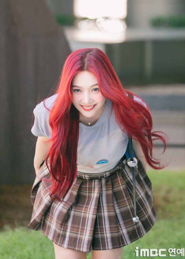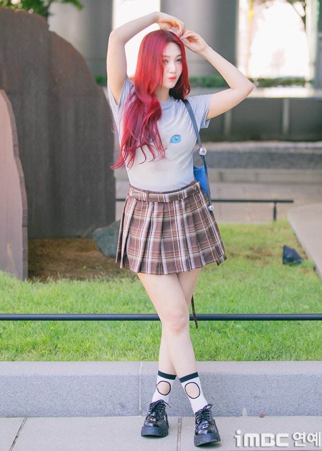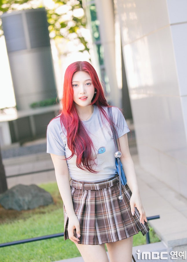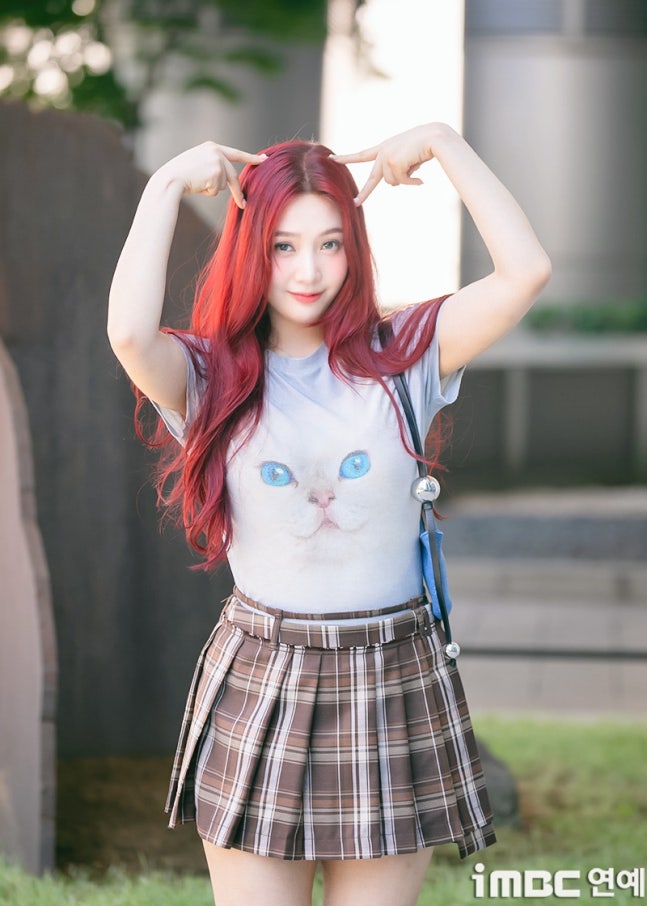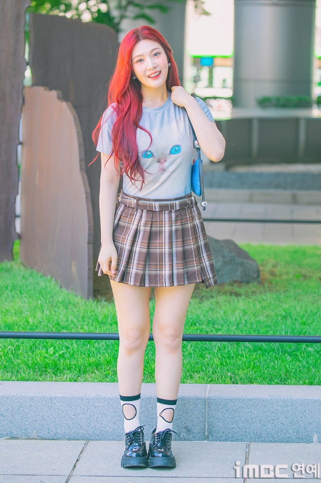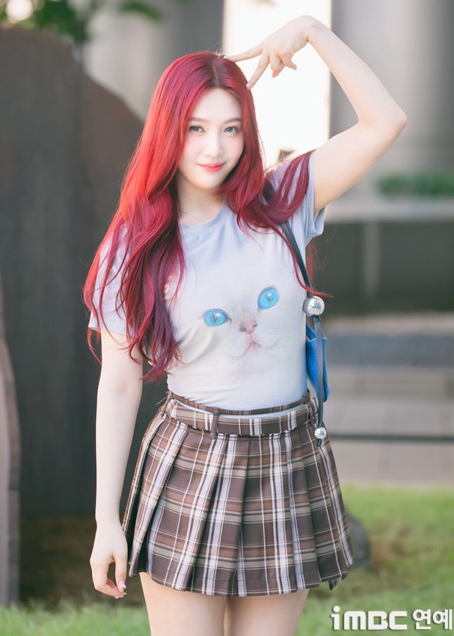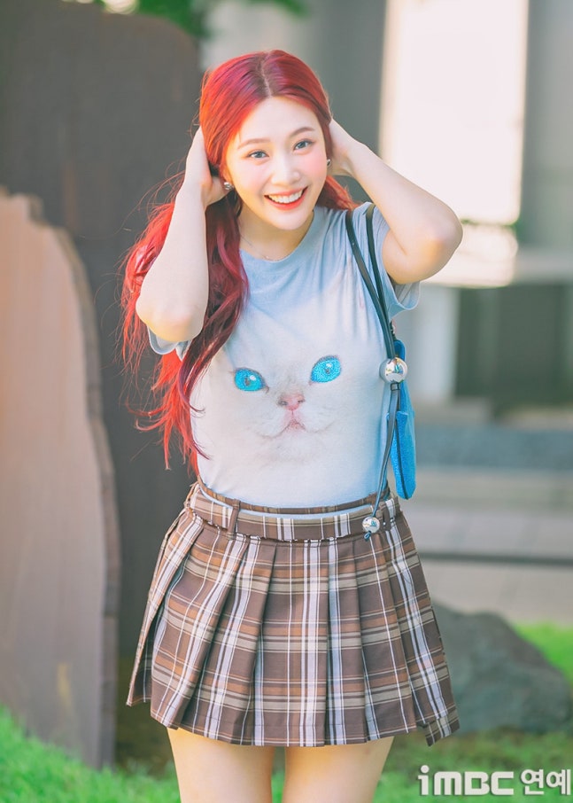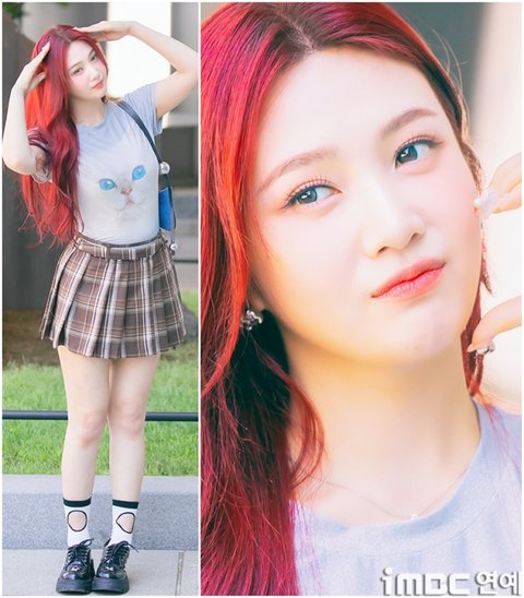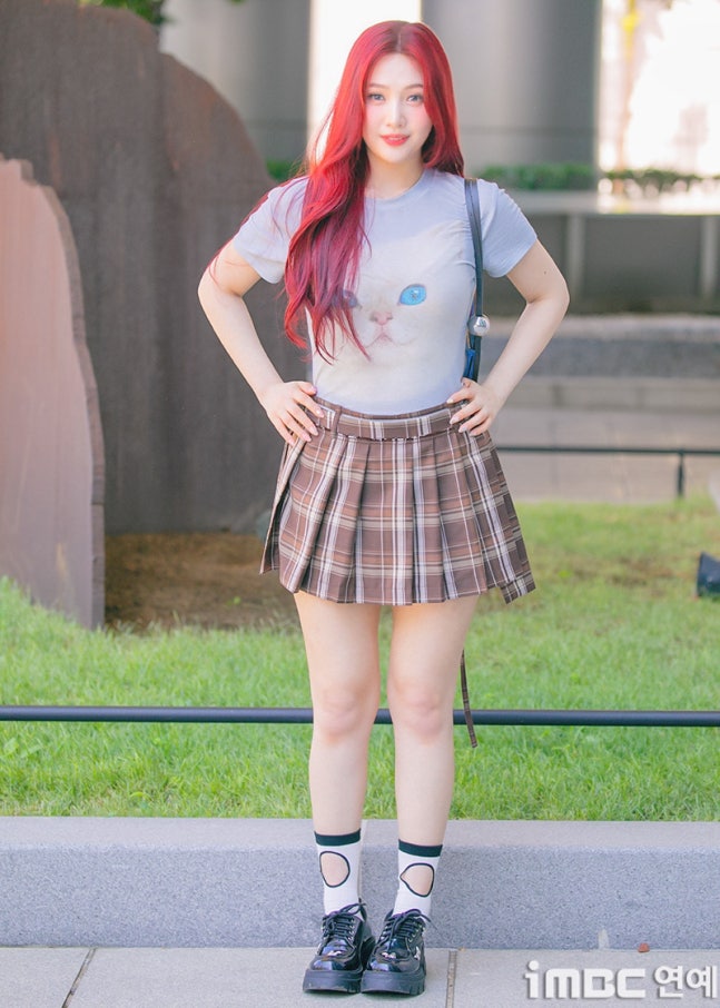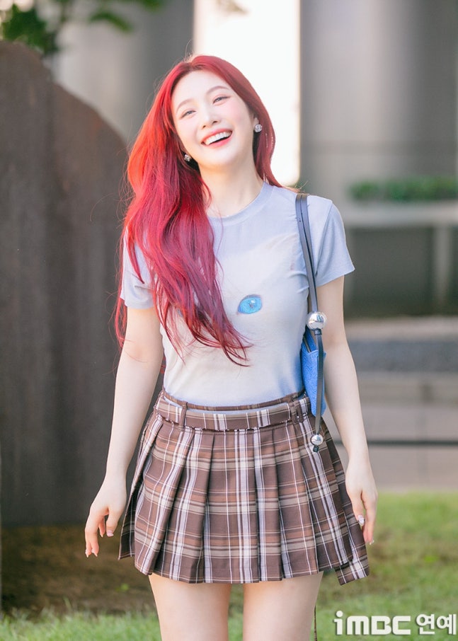 이날 조이는 '빨간맛'이 연상되는 레드 컬러의 롱 웨이브 헤어와 립으로 휴먼 체리 분위기를 드러냈다. 특히 '동물농장 마스코트'임을 입증 하듯 고양이 티셔츠를 입어 눈길을 끌었다. 고양이 눈과 블루 미니백의 색맞춤. 방울 모양의 은색 액세서리가 어우러졌다. 여기에 미니 브라운 타이탄 스커트. 구멍난 양말. 심플한 슈즈가 돋보이기도.