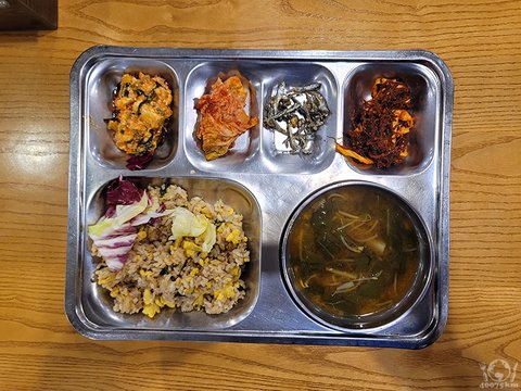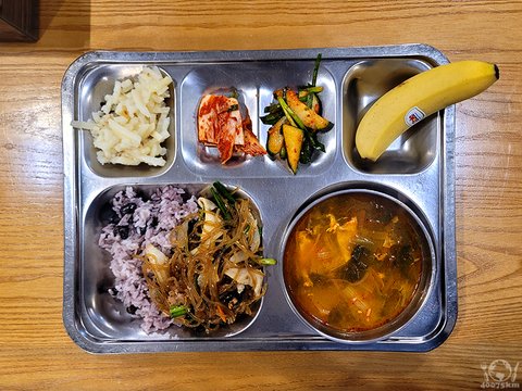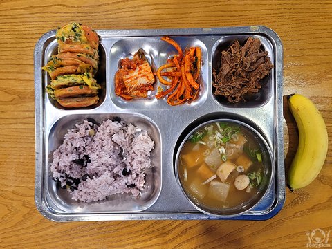 소고기장조림, 잡곡밥, 어묵무국, 옛날소세지전, 도라지오이생채, 포기김치, 계절과일.