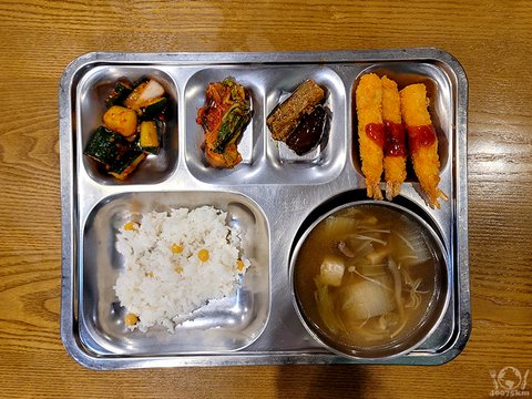 왕새우튀김, 잡곡밥, 소고기버섯찌개, 사천식가지볶음, 오이깍둑무침, 포기김치.