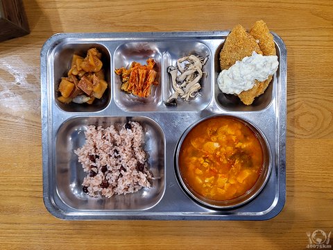 통살새우까스, 잡곡밥, 김치감자수제비, 느타리버섯피망무침, 도토리묵야채무침, 포기김치, 후식 매실에이드.