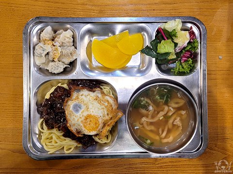 짜장소스덮밥, 면사리, 계란후라이, 유부장국, 물만두, 라유장, 양상추샐러드, 반달단무지.