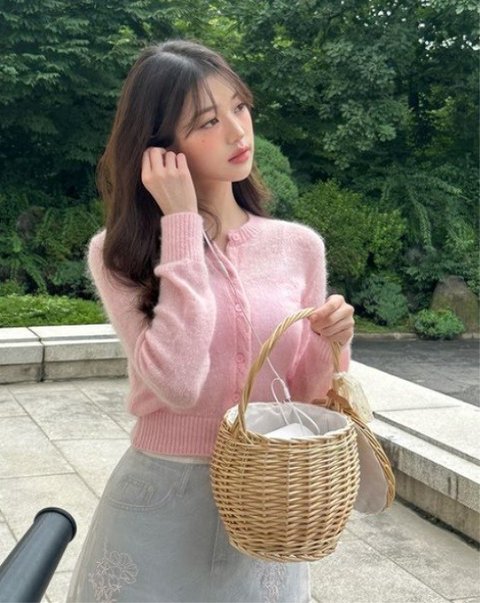 사진 속 장원영은 핑크색 카디건을 입고 화사한 룩을 보여줬다. 장원영은 줄이어폰으로 음악을 들으며 남다른 감성을 보여준다.