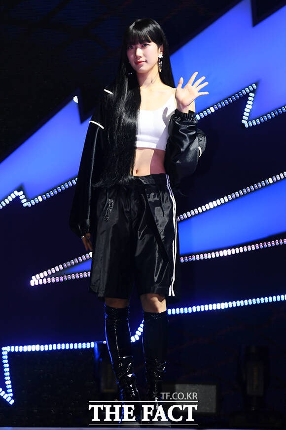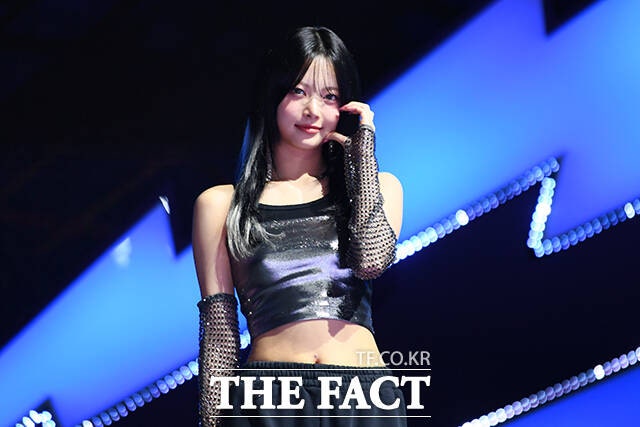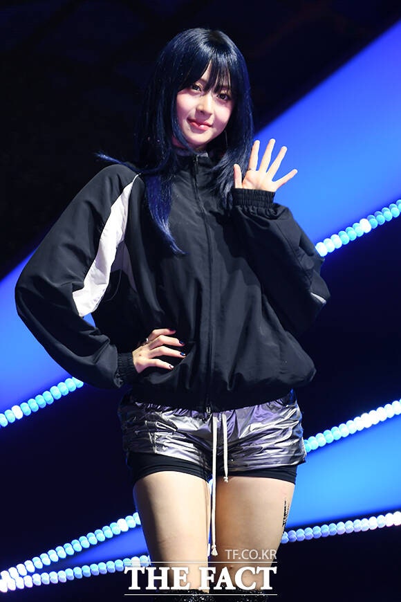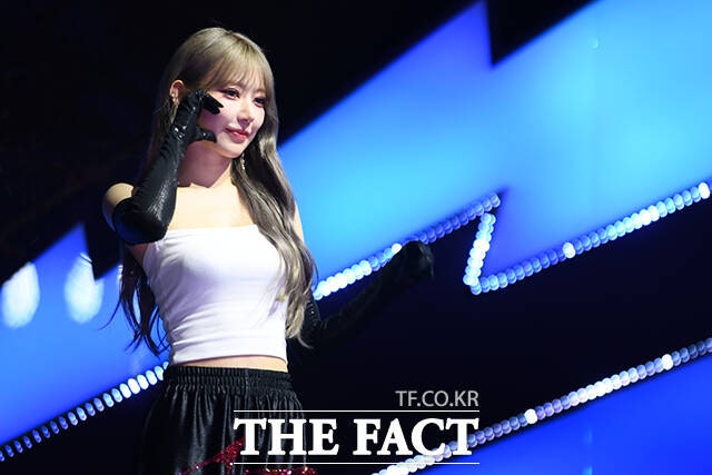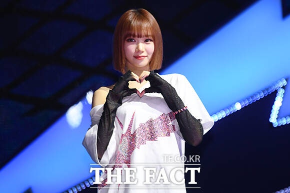 그룹 르세라핌의 허윤진과 김채원, 카즈하, 사쿠라, 홍은채가 29일 오후 서울 광진구 예스24 라이브홀에서 열린 미니 4집 'CRAZY(크레이지)' 발매 기념 쇼케이스에서 포즈를 취하고 있다.