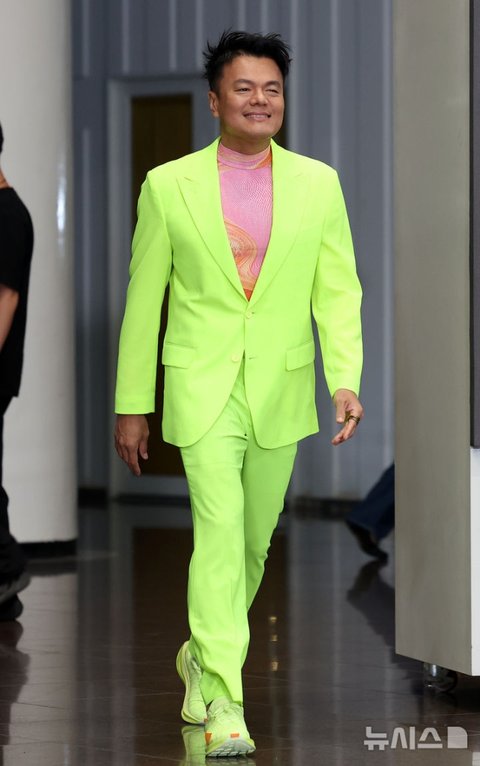 [서울=뉴시스] 이영환 기자 = 가수 겸 음악프로듀서 박진영(JYP)이 30일 오후 서울 영등포구 한국방송공사 KBS홀에서 열린 'KBS 대기획 - 데뷔 30주년 특집 딴따라 JYP' 포토월에 들어서고 있다. 2024.08.30.20hwan@newsis.com