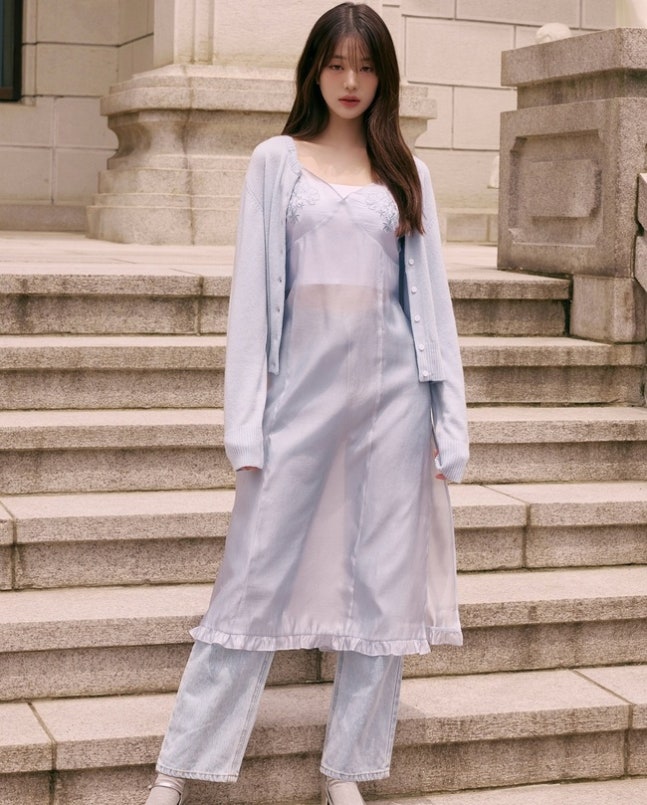 (사진=장원영 소셜미디어)이 외에도 장원영은 시스루 형태의 파스텔 컬러의 슬립 롱드레스에 카디건과 청바지를 매치한 독특한 패션까지 완벽하게 소화했다. 장원영은 모델 부럽지 않은 늘씬한 비율을 뽐냈다.