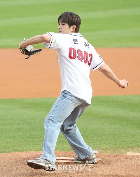 그룹 샤이니(SHINee) 멤버 온유가 두산 승리기원 시구를 하고 있다.