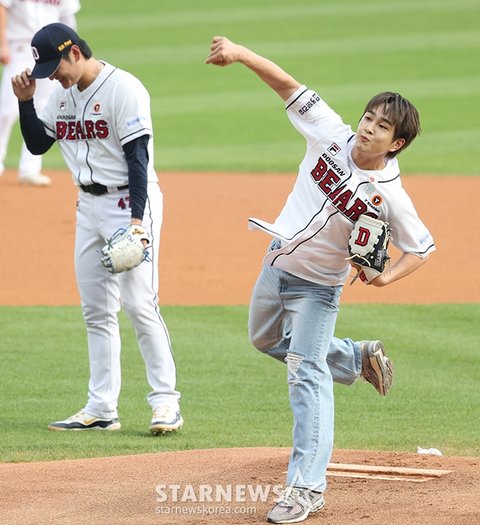 그룹 샤이니(SHINee) 멤버 온유가 두산 승리기원 시구를 하고 있다.