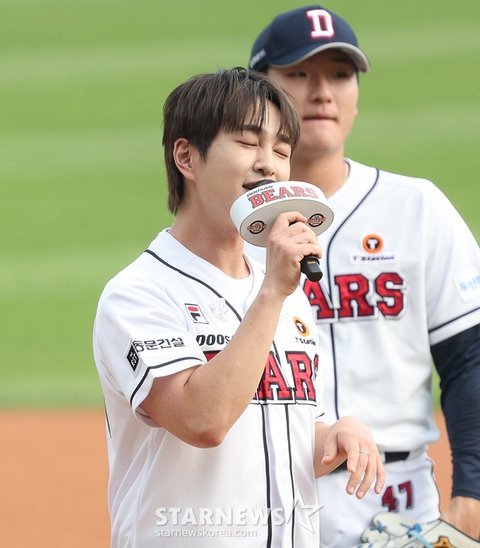 그룹 샤이니(SHINee) 멤버 온유가 두산 승리기원 시구를 하고 있다.