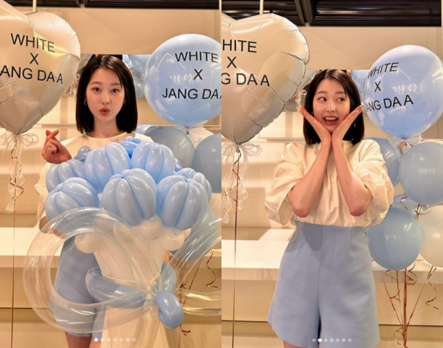 사진 속 장다아는 모델로 활동 중인 브랜드의 풍선 이벤트를 받은 모습이다. 풍선 꽃다발부터 이름이 적힌 풍선까지 청량한 색감이 눈길을 끈다. 같은 계열의 코디를 한 장다아는 손하트와 꽃받침 포즈로 아이돌 같은 끼를 뽐냈다.
