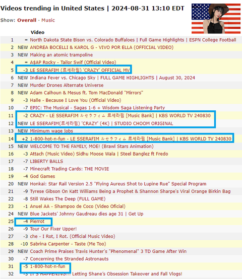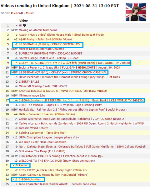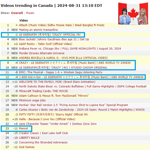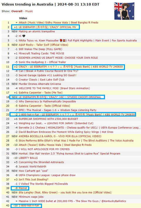 새벽에 잠 안와서 지금 낮인 미국 유튜브 트렌드 궁금해서 검색해 봤어https://kworb.net/youtube/trending/au.htmlhttps://kworb.net/youtube/trending/us.htmlhttps://kworb.net/youtube/trending/uk.htmlhttps://kworb.net/youtube/trending/ca.html