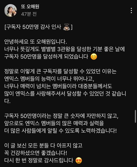 또오해원 구독자50만명 달성함