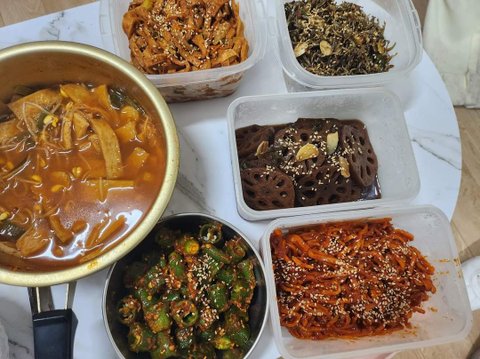 어묵콩나물국, 된장고추무침, 진미채, 연근, 멸치볶음, 어묵볶음 제가 집밥 좋아해서 반찬 만든겁니당ㅎㅎ