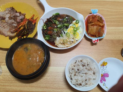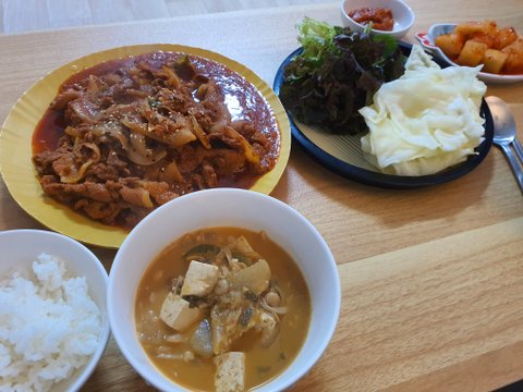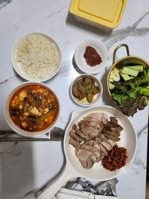 이건 순두부찌개랑 수육이랑 애호박 볶음...