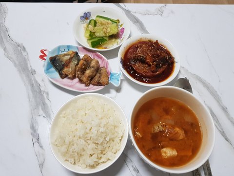 고등어 튀기고 오이탕탕이랑 무조림, 바지락된장찌개