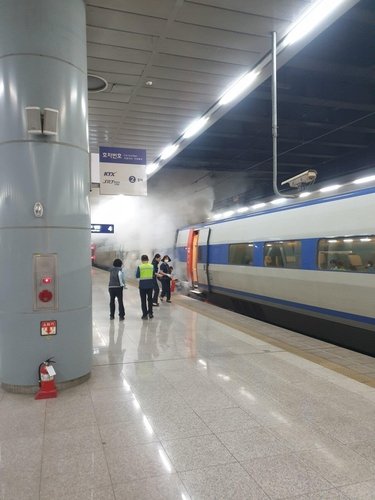 1일 오후 8시 24분께 부산 동구 부산역에 도착해 정차 중인 KTX 105호 열차의 2호차 아래 바퀴에서 갑자기 연기가 발생했다.
