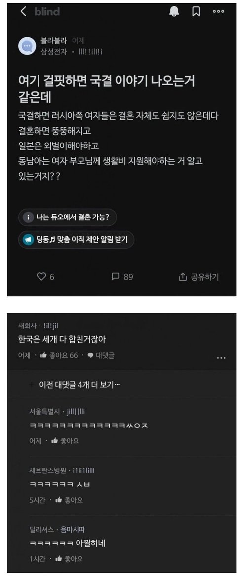 쟤들도 미치겠을걸ㅋㅋㅋ? 요새 나는 솔로만 봐도 직업 멀쩡해도 와꾸 안 되면 아무리 대단한 직업이라도 여자들이 거들떠 봐주지도 않음. 블라인드 내에서도 나름 직업은 멀쩡한데 도태된 남자들 바글바글하거든. 근데 지들 딴에는 이게 이해가 안 되는 거야. 난 직업도 괜찮고 상위 10%안에 드는 대기업이고 잘났는데 여자들이 나한테 차가워ㅋㅋㅋ 거들떠도 안 봐. 심지어 스치기만 해도 싫어해. 사적으로 연락하면 사내괴롭힘으로 신고해ㅋㅋㅋ 그러니까 국결 어쩌고 밈화 시켜서 여자들 조롱하는 거야. 현실을 2030남녀 억지로 결혼시켜도 120만명의 도태남들이 발생해서 발 동동 구르는데 여자들은 그딴 거 알빠노 결혼 더 안 하거든. 그러니 자연스럽게 도태되는 남자들의 발악임. 저거는ㅋㅋㅋ 그저 애잔할뿐.