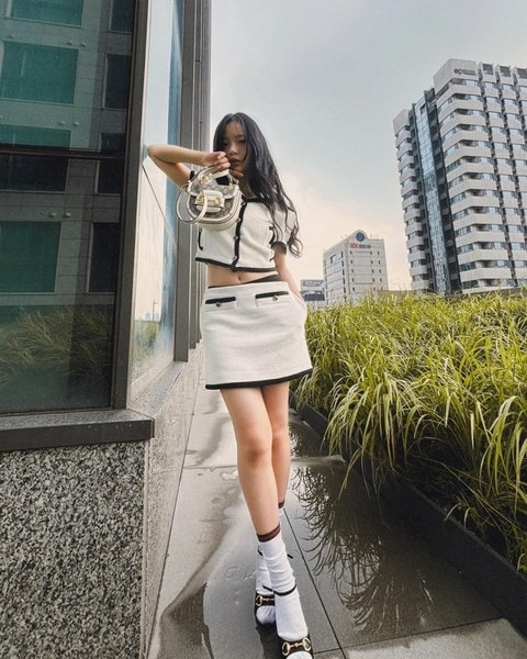 사진 속에는 하이브 사옥에서 트위드 재킷에 미니스커트 그리고 미니 탑 핸들 백으로 포인트를 준 하니의 모습이 담겼다.