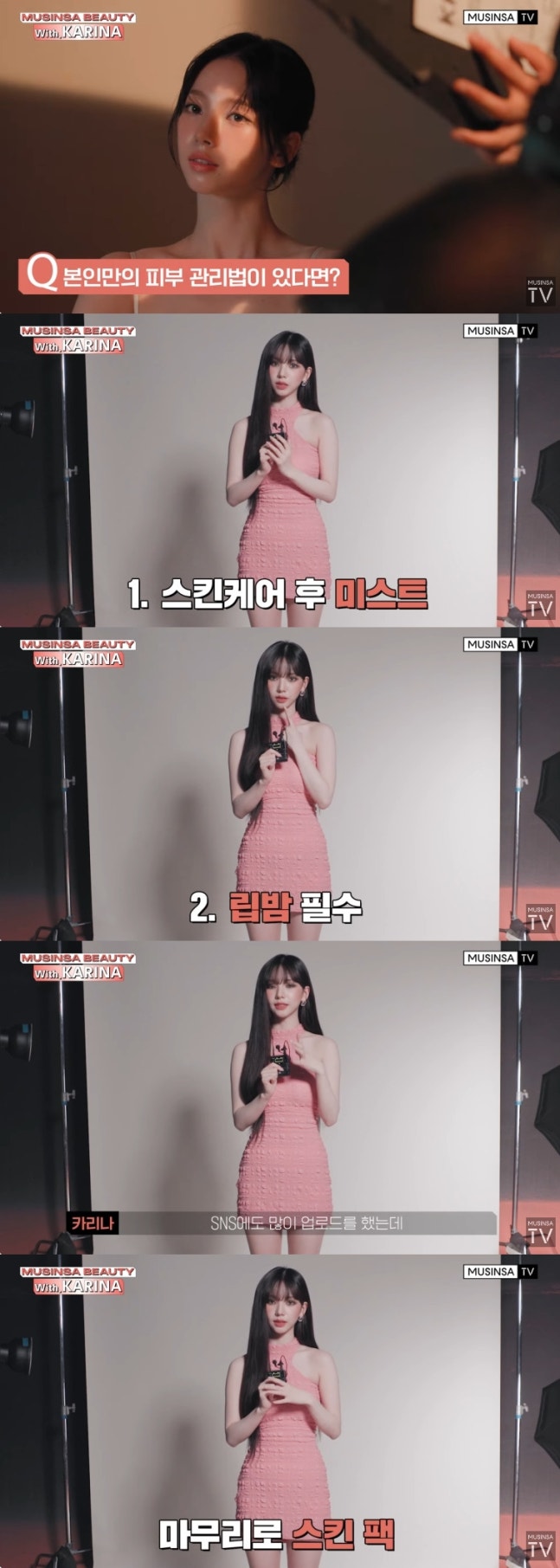 본인만의 피부 관리법을 묻자 카리나는 "일단 잘 때 스킨케어를 하고 미스트를 뿌리고 잔다"고 말했다.