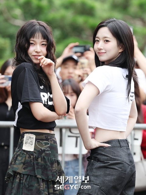 그룹 엔믹스 규진(사진 왼쪽)과 해원이 6일 오전 서울 영등포구 여의도동 KBS 신관에서 진행된 KBS2 '뮤직뱅크' 리허설에 참석해 취재진을 향해 포즈를 취하고 있다.