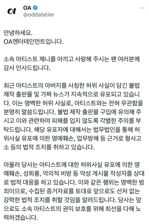 추가로 제니 성희롱 명예훼손 법적 대응한다함 ㅠㅠ드디어 해주다니 블링크들이 가장 바라던 거였을듯