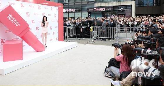 그룹 에스파 카리나 실물을 보기 위해 성수동에 인파가 몰려들었다.