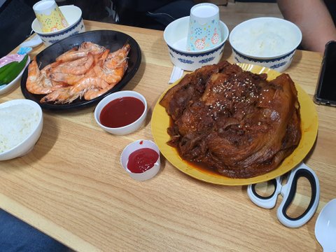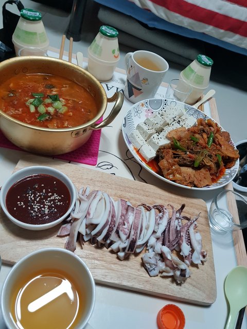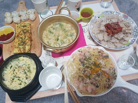 이때는 집들이라 김치찜이랑 새우찜했어요 부대찌개랑 계란말이도 있었는데 테이블이 길어서 다 안나왔어요ㅠㅠ