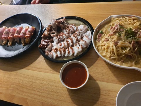 이건 문어삶고 파스타랑 베이컨말이 간단하게!!