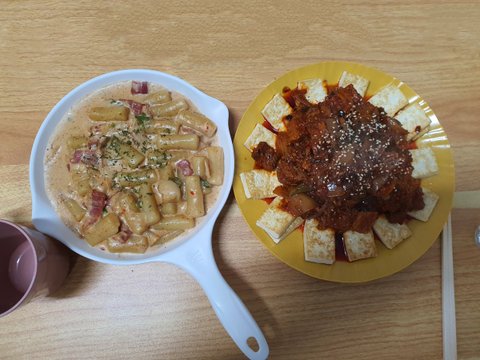 갑자기 술은 예상에 없었는데 마시게 돼서 집에있는걸루 급하게 만들어먹은 크림떡볶이랑 두부김치!!