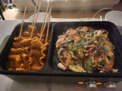 이건 매운어묵이랑 해물파전이에요 ㅎㅎ이것도 술은 예상에 없다가 집에있는걸루 급하게..