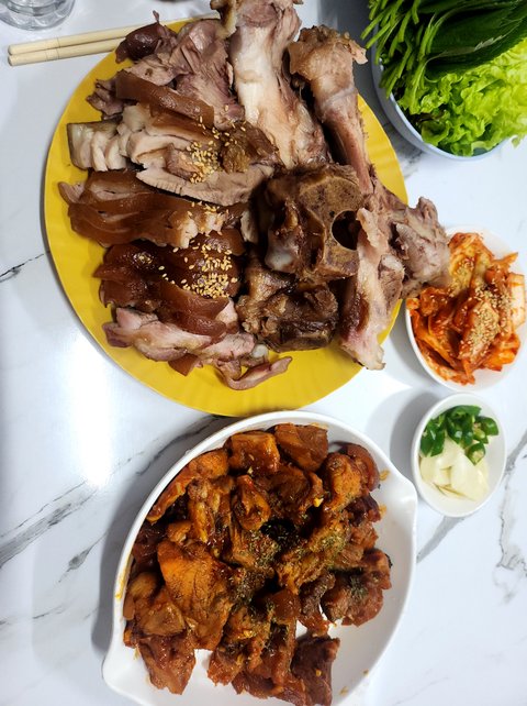 인터넷에서 돼지족발 사서 집에서 끓이고 반반족발로 만든것입니다ㅋㅋㅋㅋ친구네 어머님거랑 제 동생꺼 따로 포장해서 가져다드리고 남은게 저 양이에요 맛도있고 저렴하게 양 많게 만들 수 있는데.. 설거지가 좀 힘들어요ㅠㅜㅜ