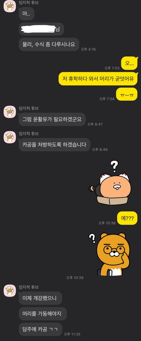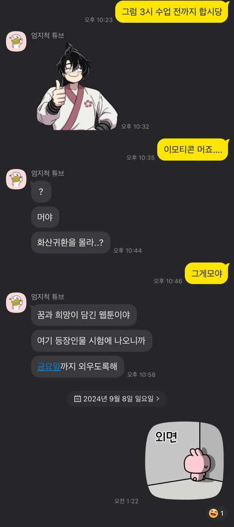 내 의사 물어볼때 ~~하는거어때? 이러면 될텐데 ~~하는게 어떠신가 이러고 첫사진에 가린부분은 우리과 이름임ㅋㅋㅋ 예를들어 내가 기계공학과면 기계공학님 이렇게 부른거..ㅋㅋㅋ 윤활유 드립도 안웃기고 임티도 자꾸 이상한거 쓰길래 못참고 한마디했더니 뭔 시험드립치면서 등장인물 외우래ㅠㅠㅜ