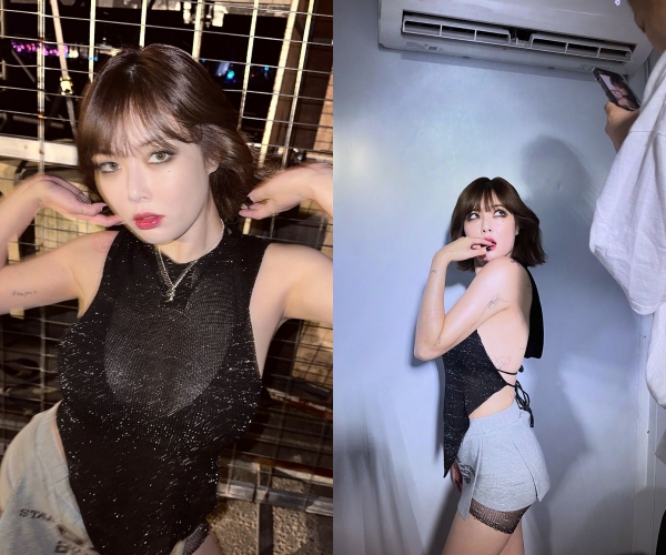 사진에서 현아는 짧은 치마에 백리스 시스루 디자인의 후드 상의를 입고 있는 모습으로 파격적인 노출이 눈길을 끈다.