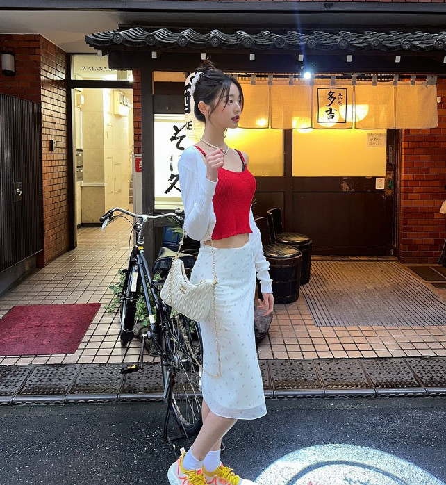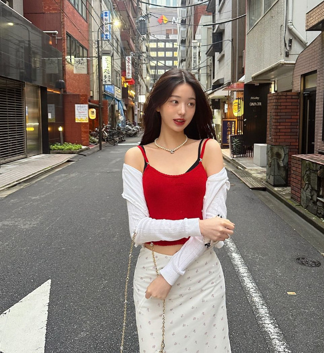 사진=장원영 소셜미디어사진 속 장원영은 빨간색 민소매 티셔츠에 흰색 카디건을 살짝 걸치고, 하의는 잔꽃무늬가 사랑스러운 롱스커트를 매치한 모습이다. 살짝 드러난 잘록한 허리와 날씬한 몸매가 눈에 띈다.