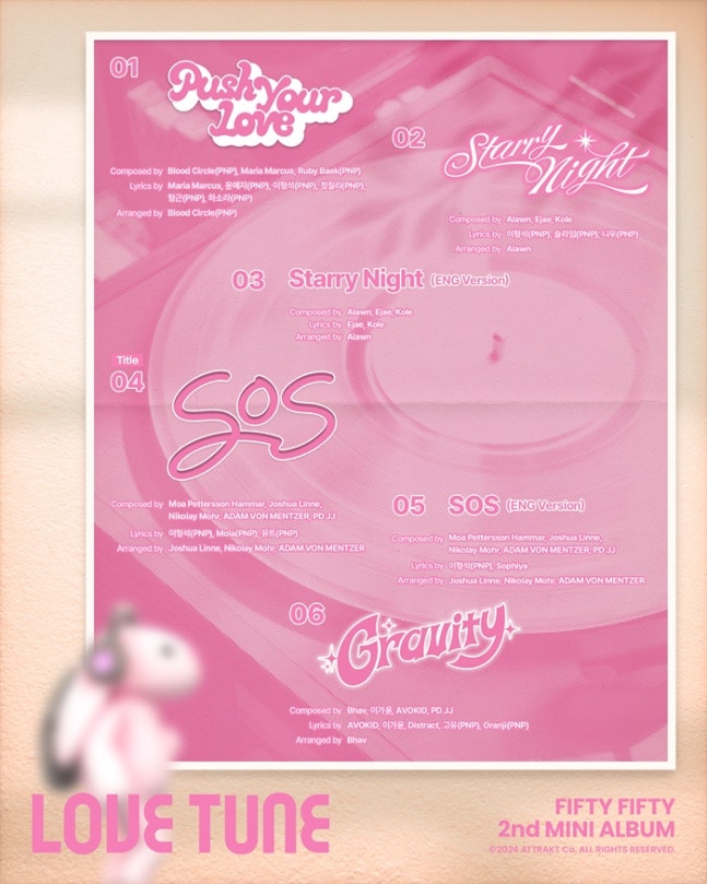 공개된 트랙리스트에 따르면 'Love Tune' 앨범에는 타이틀곡 'SOS'를 비롯해 'Push Your Love' 'Starry Night' 'Gravity', 그리고 영문 버전의 Starry Night'(ENG Version), 'SOS'(ENG Version)까지 총 여섯 개의 트랙이 수록된다.