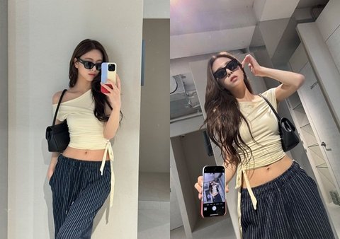 유나 소셜미디어사진 속 유나는 오프숄더 크롭티셔츠를 입고 선글라스를 쓴 채 힙한 매력을 드러내고 있다. 허리라인이 강조된 스타일링으로 인한 개미허리가 눈에 띈다.