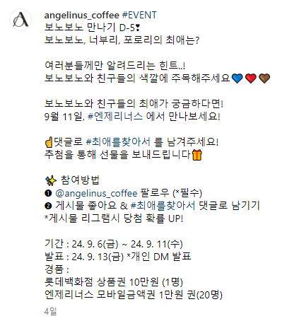 포켓몬에 이어서 이번엔 보노보노랑 콜라보하나보네??엔제리너스 왤케 열일하는겨저번에 포켓몬 콜라보 음료 나왔을때도 매장 가서 종류별로 맛보고 그랬는디이번에도 엔제리너스 자주 갈듯...ㅋㅋㅋ보노보노 음료 출시 앞두고 최애찾기 이벤트도 하던데 참여 ㄱㄱㄱ수욜까지 참여 가능엔제리너스 인스타 팔로우 + 게시글 좋아요 하고최애 찾아서 댓글 남기기만 하면 끝이라 1분컷ㅋ