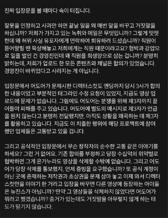 10일 신우석 감독은 개인 채널을 통해 "진짜 (어도어) 입장문을 볼 때마다 속이 터집니다"라며 "잘못을 인정하고 사과만 하면 끝날 일을 왜 매번 말을 바꾸고 거짓말을 하십니까? 저희가 가지고 있는 녹취와 메일은 무엇입니까? 그렇게 떳떳한데 왜 허위사실 유포자에게 연락하여 회유하려 드셨습니까? 직원이 뜯어말릴 땐 묵살해 놓고 저희에게는 직원 때문이라고요? 협박과 강압으로 일을 벌인 건 경영진인데 왜 직원을 희생양으로 삼는 겁니까? 분명히 밝히는데, 저희가 업로드 한 모든 콘텐츠와 채널은 합의가 있었습니다. 경영진이 바뀌었다고 사라지는 게 아닙니다"라고 얘기했다.