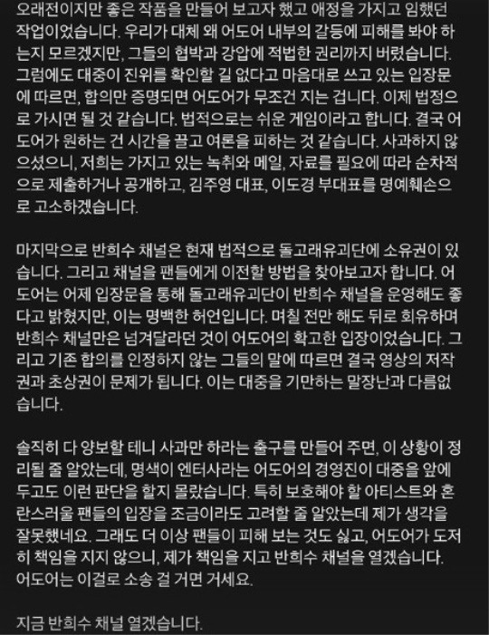 '반희수' 채널에 대해서는 "어도어는 어제 입장문을 통해 돌고래유괴단이 반희수 채널을 운영해도 좋다고 밝혔지만, 이는 명백한 허언입니다. 며칠 전만 해도 뒤로 회유하며 반희수 채널만은 넘겨달라던 것이 어도어의 확고한 입장이었습니다. 그리고 기존 합의를 인정하지 않는 그들의 말에 따르면 결국 영상의 저작권과 초상권이 문제가 됩니다. 이는 대중을 기만하는 말장난과 다름없습니다"라는 입장을 밝혔다.
