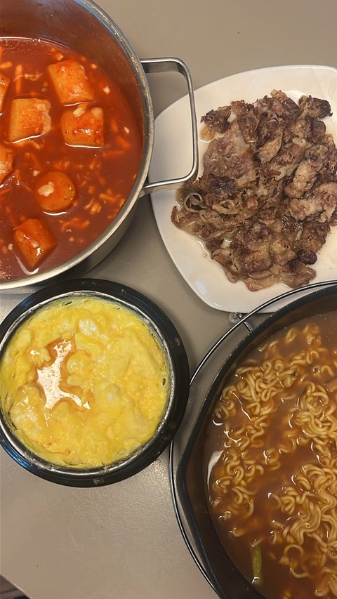 이건 제 저녁인 것 같은데요!! 떡볶이에 차돌에 계란찜에 라면까지… 동생이랑 같이 먹었던 걸로 기억해요!