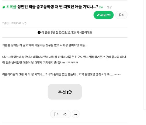 난 여기에 더해서 온갖 이상한 짓 해대면서 싸가지없게 행동하고 나대고 그랬는데... 그래서 별 안좋은 소문이 퍼짐,, 지금 재종에서 같은 중고딩 출신 볼때 반가움은 ㅈ도 없고 거기서도 이상한 소문 퍼질까봐 보기는 더 싫고 그때 왜그랬나 후회만 드네