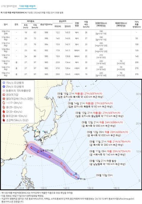 만일 GEFS 모델 예측대로 태풍이 남해안으로 온다면 시점은 9월 17일 추석 당일즈음이 될 전망이다. 한미일 기상당국의 공식 발표상 오키나와 본섬을 9월 14~15일 통과하고, GDAPS-KIM 예측에서는 상하이에 9월 15~16일쯤 도달할 것으로 보기 때문이다.