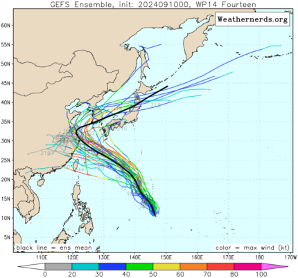 ▶다만, 그 이후를 내다보는(그래서 향후 수정 여지도 큰) 다중앙상블(GEFS) 모델을 살펴보면 태풍 버빙카 또는 풀라산이 현재의 북서진 경로를 좀 더 연장, 중국 상하이 일대로 향한다는 전망이다.