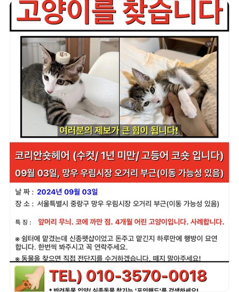 9월3일~4일 사이에 중랑구 소재의 쉼터에 방문하여 아래와 같은 앞머리 일자를 가진 코에 점있는 고등어 고양이를 보신 분도 찾습니다. 4개월 가량되었습니다.